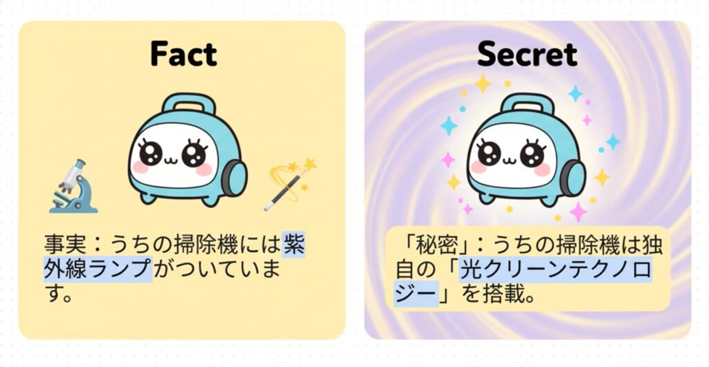 心理: 単に「紫外線ランプ」と言っても誰も驚きませんが、「光クリーンテクノロジー」という造語にすることで、「それは一体何なのか?」と興味を抱かせます。