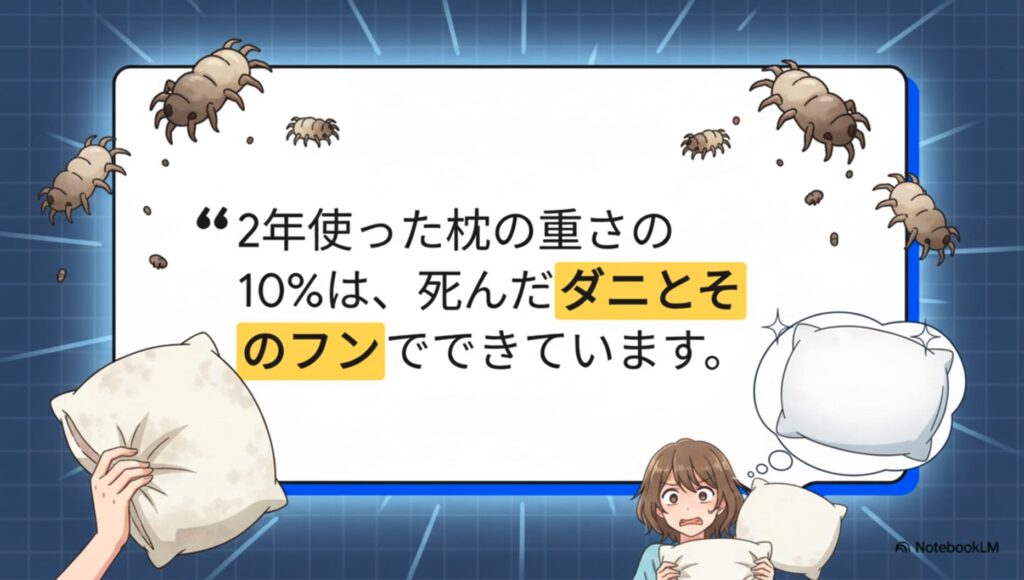 例えば、「2年使用した枕の重さの10%は、実はダニの死骸とその排泄物だ」という、恐ろしい真実を突きつけられたらどうでしょうか。例えあなたはこれまで布団の清潔さを気にしていなかったとしても、突然、「この危機から逃れたい」という強烈なモチベーションに駆り立てられるでしょう。